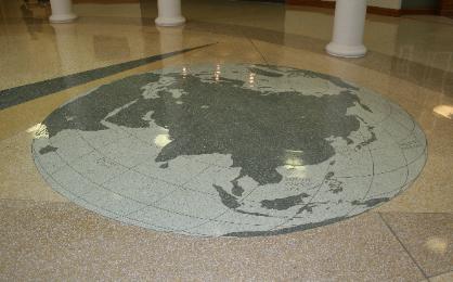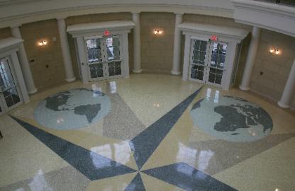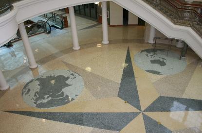 Elsewhere in the Center, students, faculty and visitors are greeted with the four faces of the globe encircling a compass rosette. |